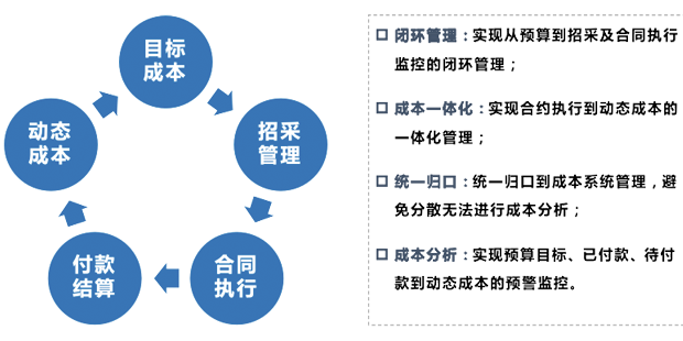 提供成本控制和预算管理功能,以确保项目的资金得以有效管理; 整合供应链管理和款项支付,以降低采购成本和提高资源利用率; 规避不必要的成本增加和风险确保项目盈利计划达成。